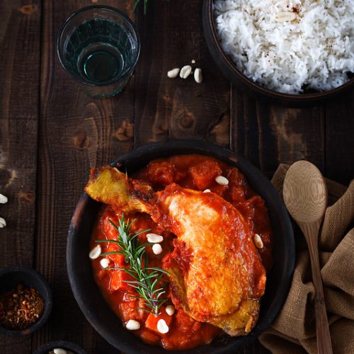 Mafé de poulet. Un délicieux poulet mijoté avec une sauce à tomber au beurre de cacahouète (le truc qui la rend si gourmande). Un plat traditionnel, d’antan, facile, équilibré et même bon marché. Parfait pour réchauffer nos coeurs d’hiver et s’évader un peu. Il s’agit du plat national du Mali mais il est répandu dans nombre de pays de l’Afrique sub-saharienne (Sénégal, Gambi, Mauritanie, Burkina Faso…) et beaucoup de débats perdurent sur l’origine. On ne vas pas rentrer là-dedans comme pour l’houmous. À l’origine ce mot (maffé, tinga déguè na…) désigne la sauce au beurre de cacahouètes et puis il a fini par désigner tout le plat en lui-même avec du poulet, du poisson ou même que des légumes. Il est plus ou moins épicé selon les pays et les familles (et les moyens car les épices sont un signe de luxe). Pour les légumes, j’y ai mis de la tomate bien sûr (la base) la patate douce, des oignons mais aussi des poireaux (pas très sénégalais ;-). Je me suis inspirée du beau livre qui fait voyager de Marie Chioca “Le Monde entier en 80 recettes” que j’ai ensuite adapté en faisant un croisement d’autres recettes. À vous de jouer avec ce que vous avez.