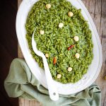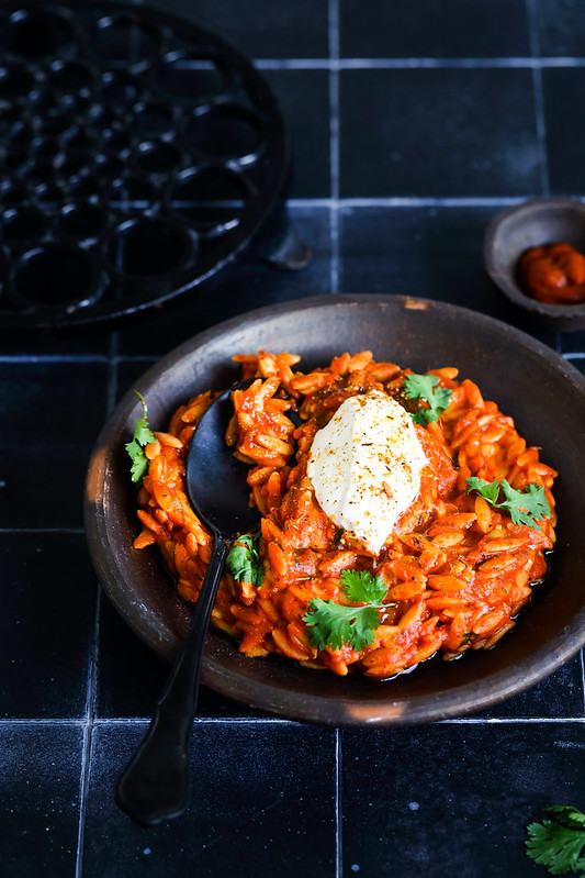 Orzo à la sauce tomate, harissa et mascarpone. Ou comment apporter du peps au quotidien, se plonger dans le sud, le rouge, les saveurs de caractère avec trop fois rien. Un plat de dernière minute et même bon marché avec ce que j’avais sous la main. Les pâtes risoni (en forme de gros grains de riz) appelée aussi orzo, sont cuites dans la sauce tomate à la place de l’eau un peu par absorption (même si je n’aime pas du tout le concept de one pot pasta, ici c’est un peu différent 😉 pour avoir un rendu intense en goût (cela se fait beaucoup dans la cuisine grecque par exemple). Il y a ensuite d’autres contrastes : le piquant de la harissa et la douceur blanche du mascarpone. Un plat super réconfortant qui fait très Méditerranée, on voyage un peu en Tunisie, un peu en Grèce et un peu en Italie.