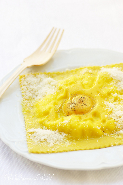 …Ravioli géants à la ricotta, oeuf et huile de truffe (pour 4 gros ravioli) Pâte: – 100 g de farine + un peu – 1 oeuf entier (50 g) –…