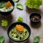 Conseils :Conservation : la soupe, sans la garniture, se conserve un jour au frais. Les tuiles de parmesan aussi se conservent un jour dans une boîte à température ambianteGoût, textures : désormais vous me connaissez, j'aime beaucoup les soupes avec peu d'ingrédients où l'on sent le légume presque pur. Le chou romanesco est très doux (plus qu'un chou classique même si ça reste un chou), les épinards qui restent très discrets apportent une note verte, les tuiles donnent du peps ainsi que les graines et les pistaches avec leur croquant.Variantes : sur cette base vous pouvez utiliser un brocoli ou un chou-fleur. Vous pouvez ajouter des herbes comme du persil plat ou de la coriandre. Vous pouvez servir avec des lardons sautés ou des chips de magret de canard par exemple comme dans ce risotto au potimarron.